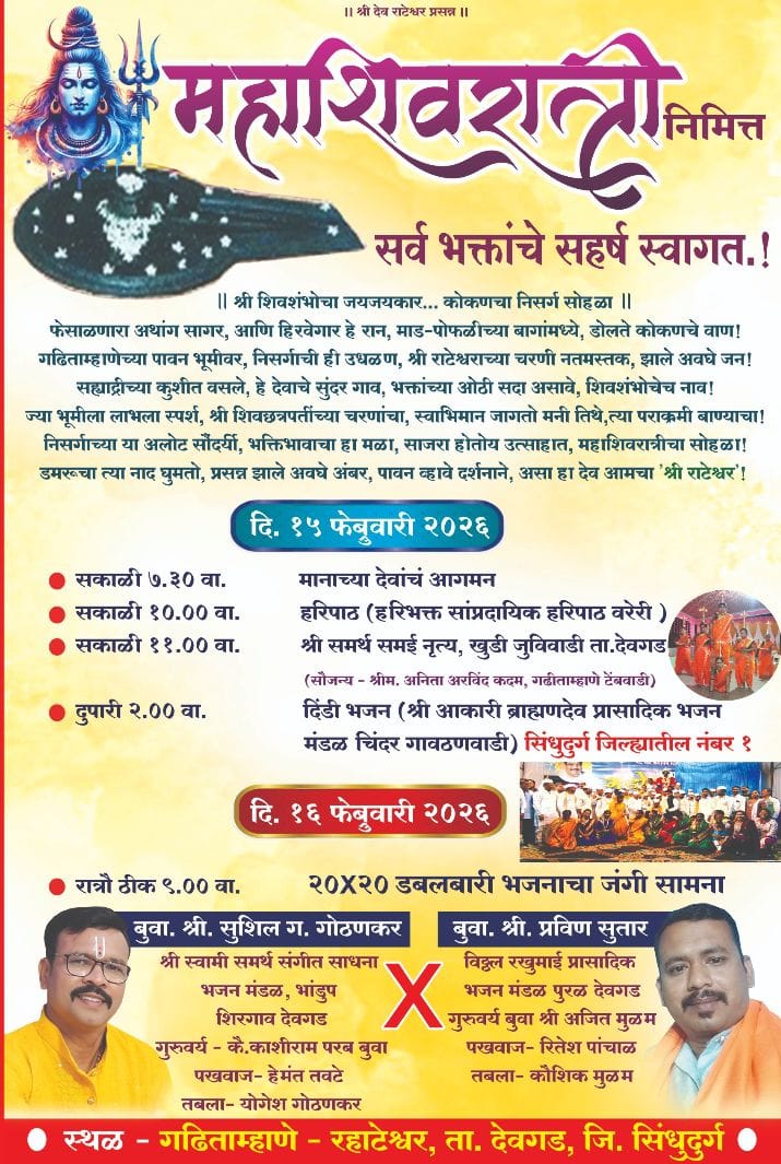 देवगड तालुक्यातील गढी-ताम्हाणे-राटेश्वर येथे महाशिवरात्रीनिमित्त १५ व १६ फेब्रुवारी २०२६ रोजी विविध धार्मिक व सांस्कृतिक कार्यक्रमांचे आयोजन करण्यात आले आहे. भक्तांसाठी हरिपाठ, श्री समर्थ नृत्य, दिंडी भजन तसेच मानाच्या देवांचे आगमन असे विविध कार्यक्रम होणार असून परिसरात भक्तिमय वातावरण निर्माण होणार आहे.