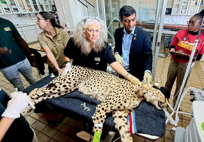 सोमवारी नामिबियातील भारतीय उच्चायुक्त प्रशांत अग्रवाल यांच्या उपस्थितीत मध्य प्रदेशातील कुनो नॅशनल पार्कमध्ये स्थायिक होण्यापूर्वी चीता संवर्धन निधीतील तज्ज्ञांच्या आंतरराष्ट्रीय पथकाकडून आफ्रिकन चित्ताची पहिली आरोग्य तपासणी करण्यात आली. छायाचित्र: ANI छायाचित्र