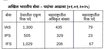 ०१ जानेवारी २०२५ रोजीच्या नागरी यादीनुसार आयएएस (IAS), आयपीएस (IPS) आणि आयएफएस (IFS) या अखिल भारतीय सेवांमधील कॅडरनिहाय रिक्त पदांची माहिती समोर आली आहे. देशपातळीवरील तसेच महाराष्ट्रातील अधिकृत संख्या आणि रिक्त पदांचा आढावा घेतल्यास प्रशासनात मोठ्या प्रमाणावर पदे रिक्त असल्याचे दिसून येते.