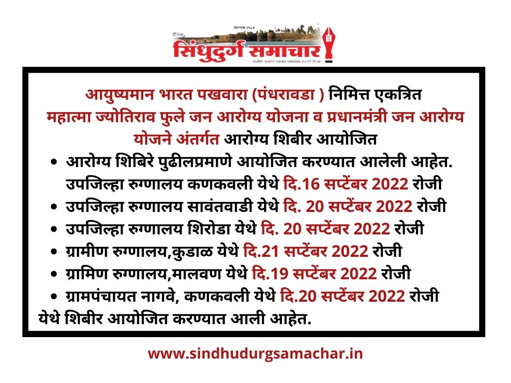 आरोग्य शिबिरे पुढीलप्रमाणे आयोजित करण्यात आलेली आहेत. उपजिल्हा रुग्णालय कणकवली येथे 16 सप्टेंबर 2022 रोजी तसेच उपजिल्हा रुग्णालय सावंतवाडी येथे 20 सप्टेंबर 2022 रोजी व उपजिल्हा रुग्णालय शिरोडा येथे 20 सप्टेंबर 2022 रोजी आणि ग्रामीण रुग्णालय,कुडाळ येथे दि.21 सप्टेंबर 2022 रोजी व ग्रामिण रुग्णालय, मालवण येथे 19 सप्टेंबर 2022 रोजी आणि ग्रामपंचायत नागवे, कणकवली येथे 20 सप्टेंबर 2022 रोजी येथे शिबीर आयोजित करण्यात आली आहेत.