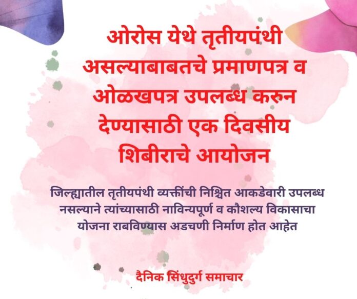 ओरोस: ओरोस येथे तृतीयपंथी व्यक्तींना तृतीयपंथी असल्याबाबतचे प्रमाणपत्र व ओळखपत्र उपलब्ध करुन देण्यासाठी एक दिवसीय शिबीराचे आयोजन करण्यात आले आहे. या शिबिराचे आयोजन डॉ. बाबासाहेब आंबेडकर सामाजिक न्याय भवन, ओरोस येथे रविवार दिनांक 29 मे रोजी सकाळी 10 ते सायं 5 वाजेपर्यंत करण्यात आले आहे.