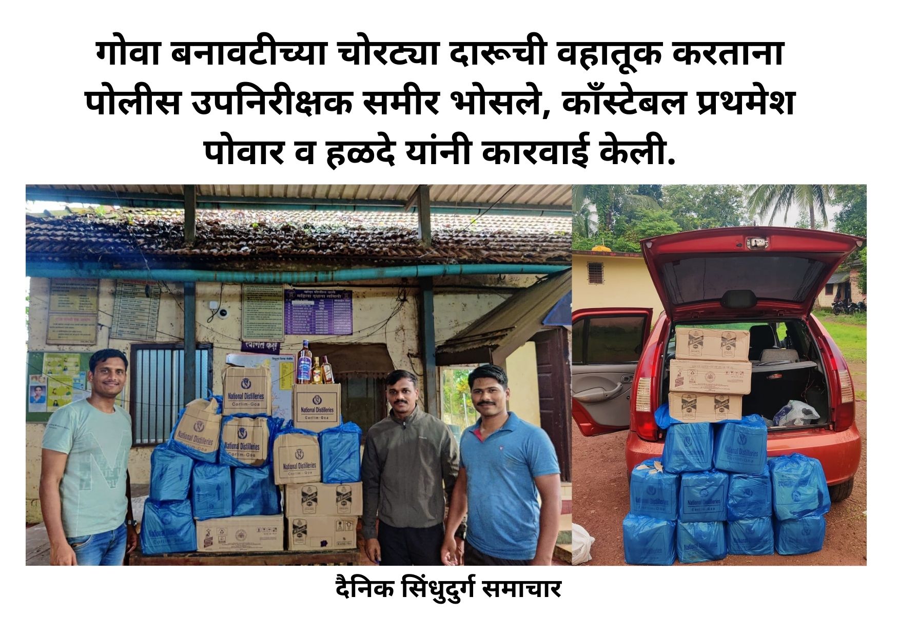 बांदा – पत्रादेवी मार्गावर गोव्यातून येणारी कार (एमएच ४६ एन ४९३४) तपासणीसाठी थांबविण्यात आली. यावेळी कारमध्ये गोल्डन फाईन व्हिस्कीच्या १२० बाटल्या (किंमत ३९,६०० रुपये), मॅकडॉवेल नं. १ व्हिस्कीच्या ९६ बाटल्या (१८,४३२ रुपये) व रॉयल स्टॅग व्हिस्कीच्या ४८ बाटल्या (११,५२० रुपये) अशी एकूण ६९ हजार ५५२ रुपयांची दारु जप्त करण्यात आली. कोल्हापूरच्या दोघा तरुणांना याप्रकरणी ताब्यात घेण्यात आले.ही कारवाई पोलीस उपनिरीक्षक समीर भोसले, काँस्टेबल प्रथमेश पोवार व हळदे यांनी केली.