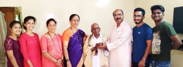 फोटोओळी – वयाच्या ८८व्या वर्षीही मुलांना मार्गदर्शन करणा-या लवू देसाई या निवृत्त शिक्षकांचा एम.के.गावडे यांनी सत्कार केला.
