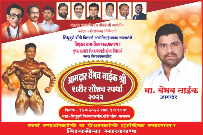 मालवण– आमदार वैभव नाईक यांच्या संकल्पनेतून सिंधुदुर्ग बॉडी बिल्डर्स असोसिएशनच्या मान्यतेने तसेच सिंधुरत्न कला क्रीडा मंडळ मालवण व युवक कल्याण संघ कणकवली यांच्या वतीने भव्य जिल्हास्तरीय “आमदार वैभव नाईक श्री” शरीर सौष्ठव स्पर्धा २०२२ चे आयोजन करण्यात आले आहे.मालवण दांडी बीच येथील पर्यटन महोत्सवात १३ मे २०२२ रोजी सायंकाळी ०५ ते १० वा.या वेळेत ही स्पर्धा संपन्न होणार आहे.