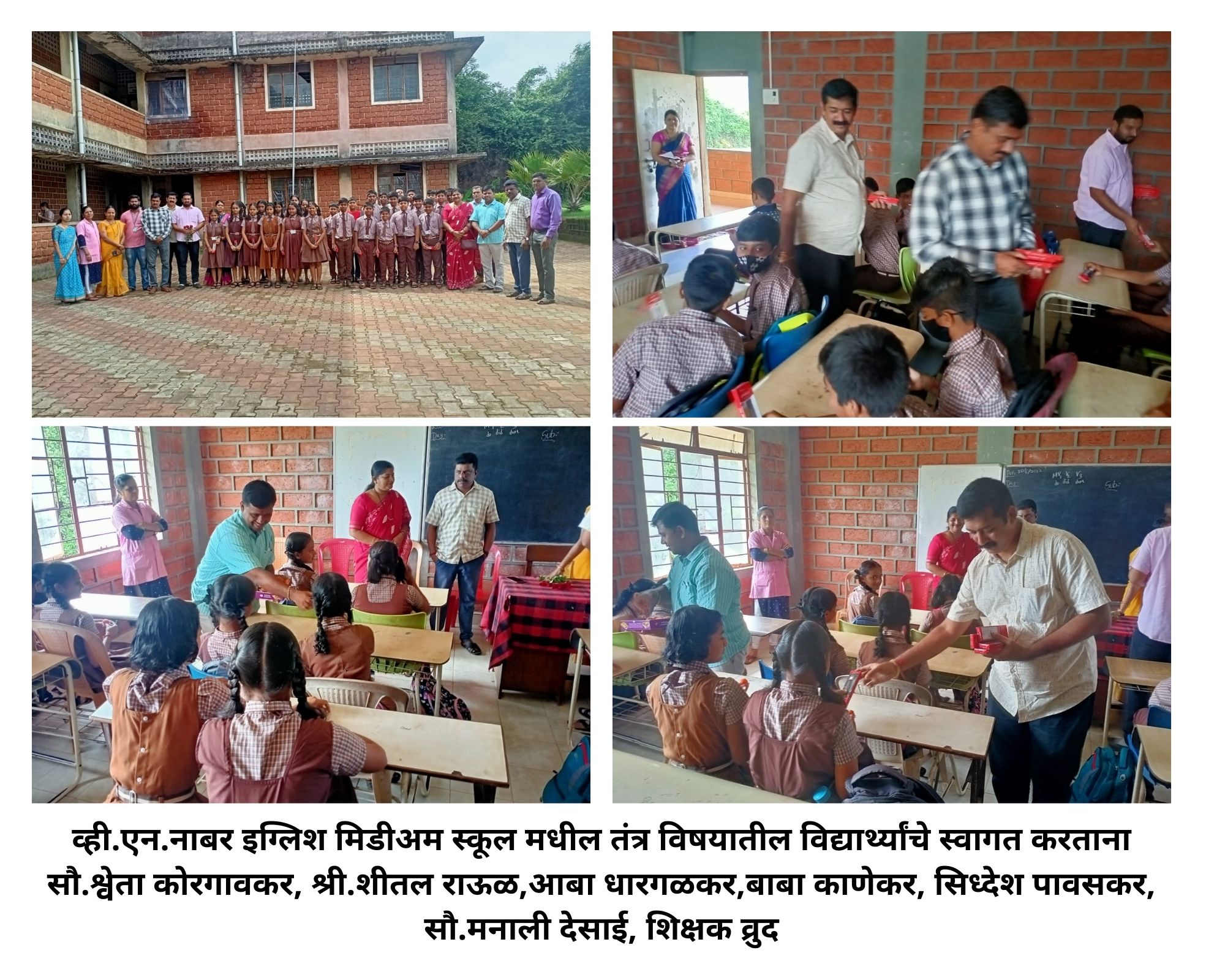 व्ही.एन.नाबर इग्लिश मिडीअम स्कूल मधील तंत्र विषयातील विद्यार्थ्यांचे स्वागत करताना सौ.श्वेता कोरगावकर, श्री.शीतल राऊळ,आबा धारगळकर,बाबा काणेकर, सिध्देश पावसकर, सौ.मनाली देसाई, शिक्षक व्रुद