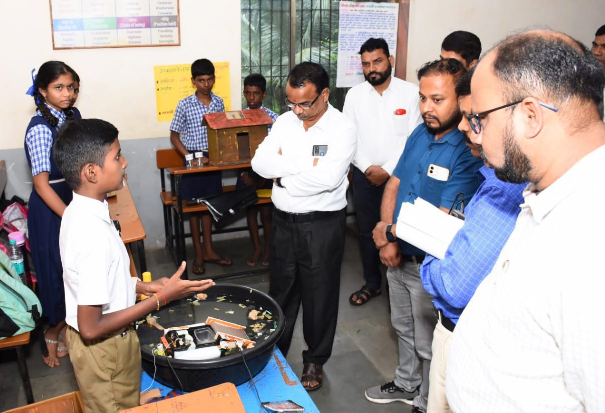 फोटोओळी – विज्ञान प्रदर्शनात विद्यार्थ्यांनी मांडलेल्या प्रतिकृतींची मान्यवरांनी माहिती घेतली.