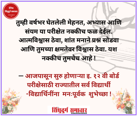 तुम्ही वर्षभर घेतलेली मेहनत, अभ्यास आणि संयम या परीक्षेत नक्कीच फळ देईल. आत्मविश्वास ठेवा, शांत मनाने प्रश्न सोडवा आणि तुमच्या क्षमतेवर विश्वास ठेवा. यश नक्कीच तुमचेच आहे—१२ वी बोर्ड परीक्षेसाठी राज्यातील सर्व विद्यार्थी -विद्यार्थिनींना मनःपूर्वक शुभेच्छा!
