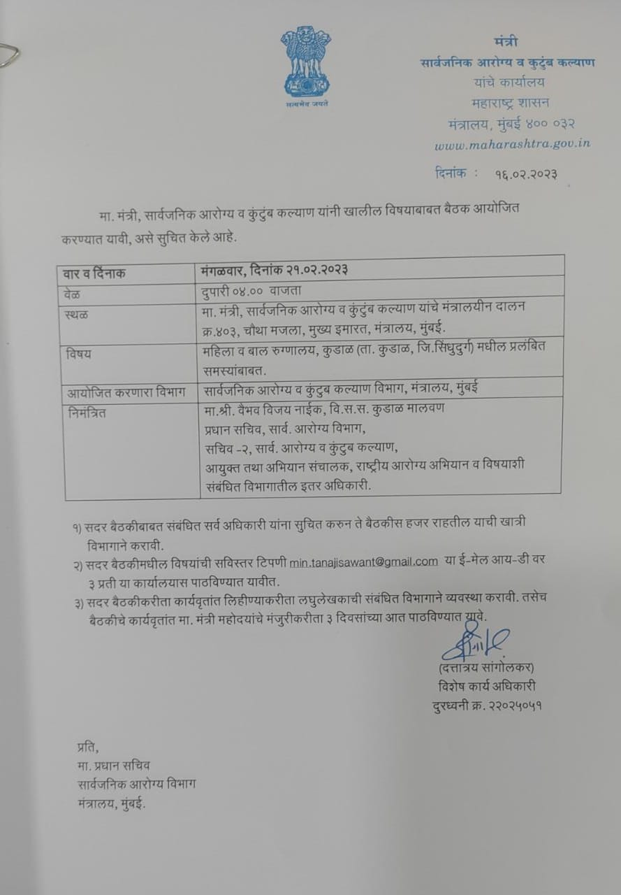 कुडाळ – कुडाळ येथील महिला व बाल रुग्णालयातील प्रलंबित समस्यांबाबत बैठक लावण्याची मागणी कुडाळ मालवण विधानसभा मतदारसंघांचे आमदार वैभव नाईक यांनी राज्याचे सार्वजनिक आरोग्य मंत्री ना. तानाजी सावंत यांच्याकडे केली होती. या मागणीची दखल घेऊन सार्वजनिक आरोग्य व कुटुंब कल्याण विभागामार्फत मुंबई मंत्रालय येथे उद्या मंगळवार दि. २१ फेब्रुवारी रोजी सदरची बैठक आयोजित करण्यात आली आहे.https://sindhudurgsamachar.in/sindhudurg-किल्ले-सिंधुदुर्ग-येथे/